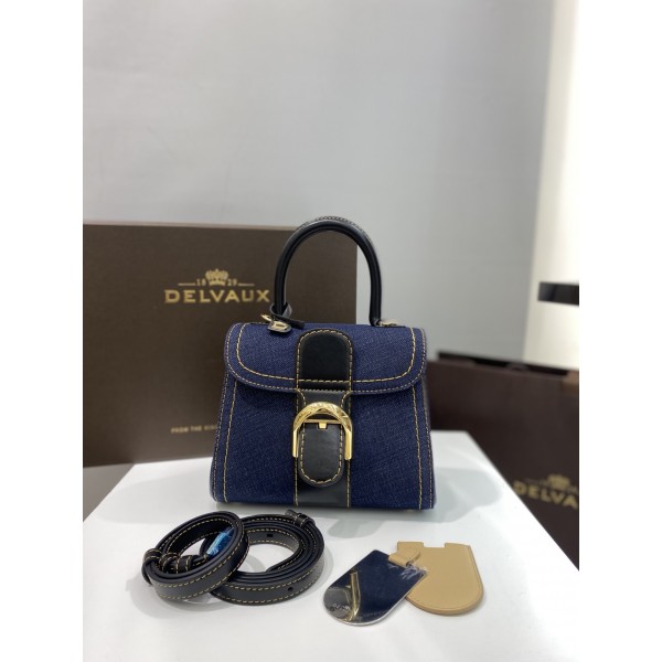 Delvaux Brillant Trench 데님 컬렉션 일본 면 타닌 소재에 블랙 광택 송아지 가죽 장식 디테일 네이비 타닌 원단으로 옐로우 십자 스티치를 포인트 전체적인 아름다움을 표현하였으며 우아함 속에 시크함이 묻어남 size : 20*12*15.5cm