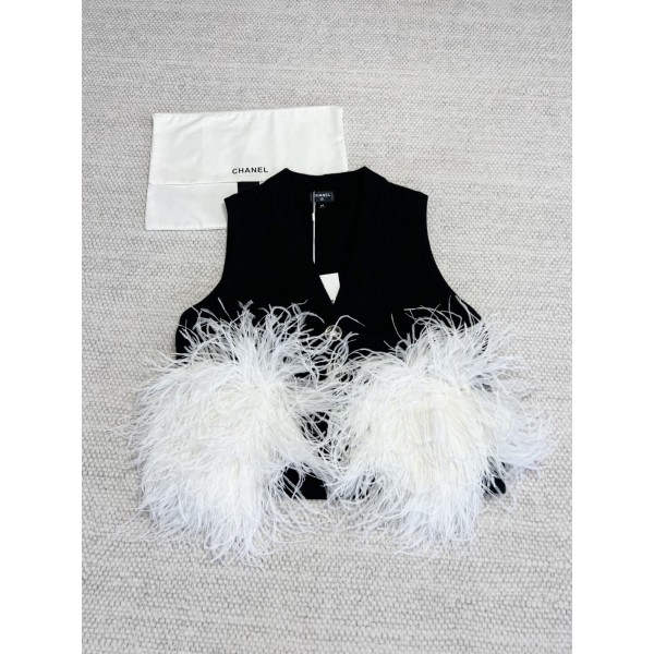 CC 23K 깃털 조끼, ZP39800 원본과 동일한 캐시미어 실로 속칭 소프트 골드 촉감이 섬세하고 부드럽고 편안함 붙어서 입어도 너무 편해요 포켓 올핸드메이드 타조털장식 너무 예뻐요