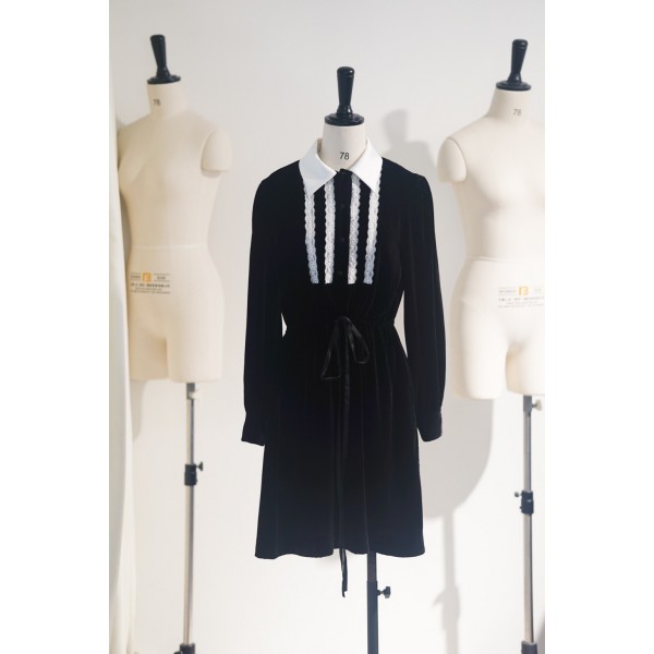 GUCC* 23 가을 겨울 레이스 수술 벨벳 원피스 부드러운 실크 벨벳 원단을 사용하여 블랙&화이트 모던한 디자인 정장 면 터틀넥으로 실루엣을 보정하고 세로줄 레이스 레이스로 프렌치 룩을 살려주며 허리 스트랩 슬림핏 최고판 발매