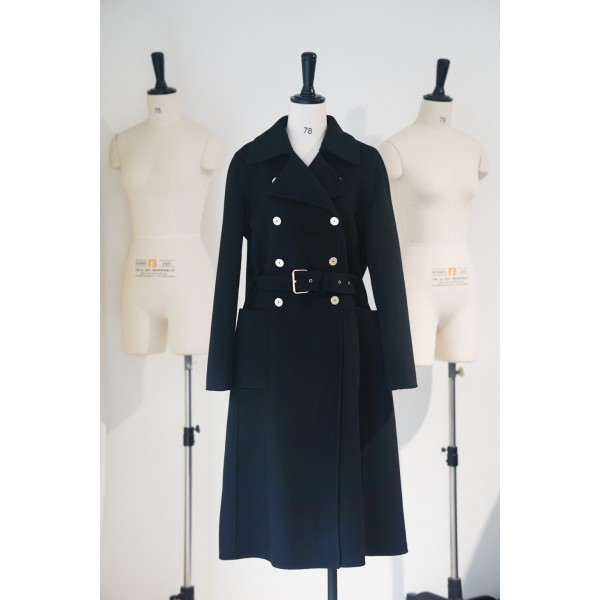 DIOR 23 추동 보트 닻 골드 블랙 골드 캐시미어 코트 블랙 양면 울과 캐시미어 혼방 원단으로 정성스럽게 제작되었으며 양쪽 패치 포켓과 골드 톤의 닻 벨트 버클이 허리라인을 살려 시즌 다양한 룩에 고급스러움을 더해줌