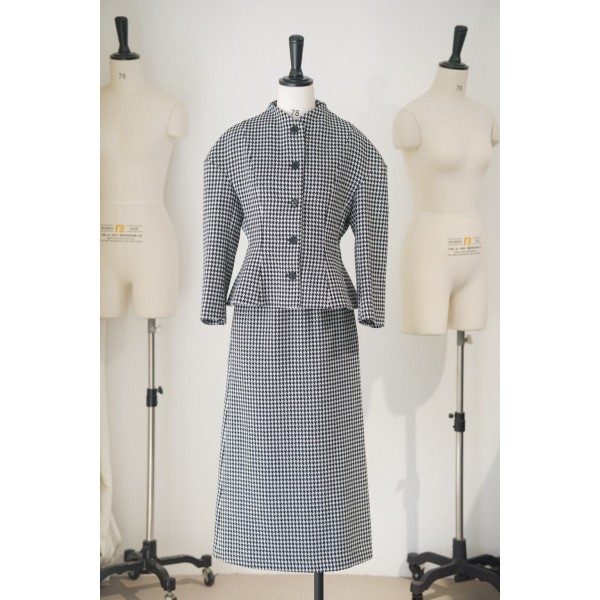 DIOR 23 추동 천조 체크 하프코트 블랙과 화이트 컬러의 울 체크 패턴으로 슬림한 실루엣의 둥근 숄더로 볼륨감을 주며 스탠드 칼라는 펜슬 스커트에 매치하여 세련되고 고급스러운 룩을 연출가능