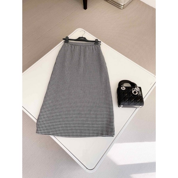 DIOR 23 추동 천조 체크 스커트 블랙과 화이트 컬러의 울 체크 패턴으로 슬림한 클래식한 실루엣 하운드투스 모직 패턴으로 스트레이트 컷팅 허리 아래 주름 디테일이 있어 이 라인의 다른 하운드투스 아이템과 매치하여 세련된 연출이 가능