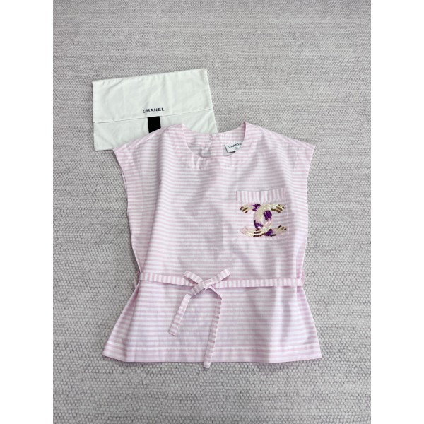 CC 24C 스트라이프 T 오리지널 커스텀 코튼 포플린 원단에 선염 자카드 되어 있고 위에 로고 모두 원단에 짜여져 있어 훨씬 고급스러워 보여요, ZP 디테일이 일치해요 가슴 비딩 로고 자수 디자인으로 기존 같은 원단의 스커트와 매치 가능함