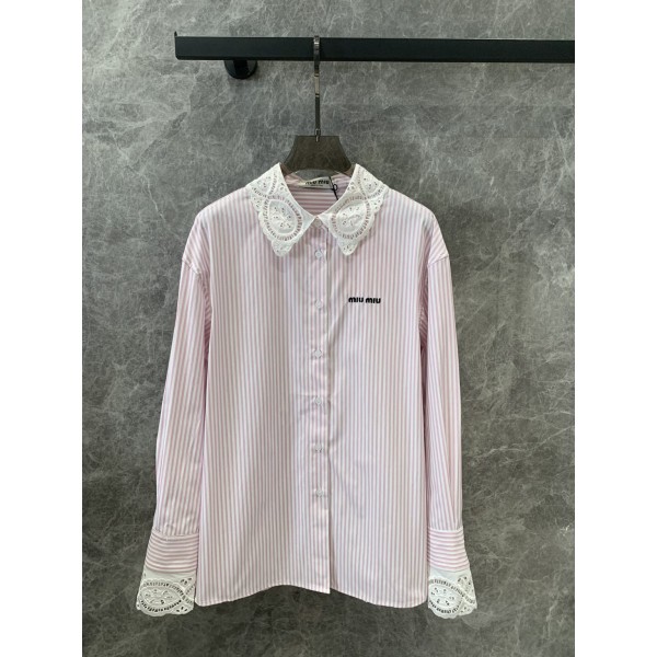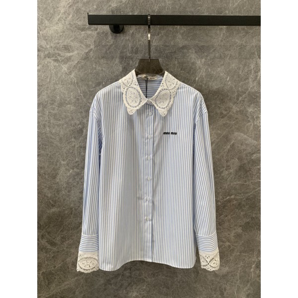미우미우 24FW 초가을 신상 자수레터링 스트라이프 긴팔 셔츠 스트라이프 셔츠는 정말 옷장에서 빠질 수 없는 아이템 칼라와 소매 끝부분의 레이스 패치 포인트 작업 품질은 디테일을 보세요
