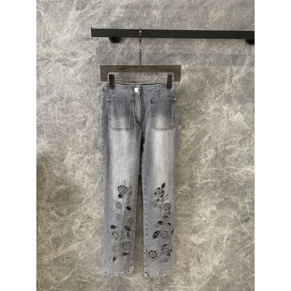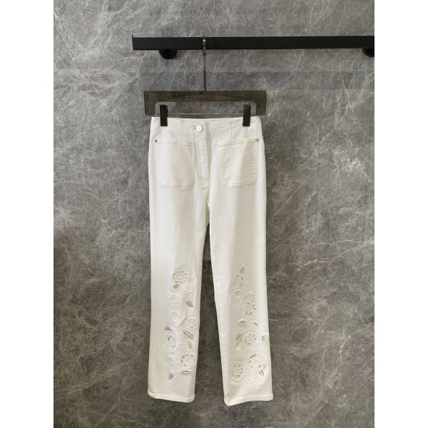 Chanel 24P 봄여름 신상 투포켓 펀칭 레이저 자수 데님 팬츠 고직수 유기농 순면 데님으로 질감이 부드럽고 섬세하며 포지셔닝 플라워 컷팅 펀칭 자수 공법에 슬림해 보이는 아이템 멋스러우면서도 고급스러운 톤