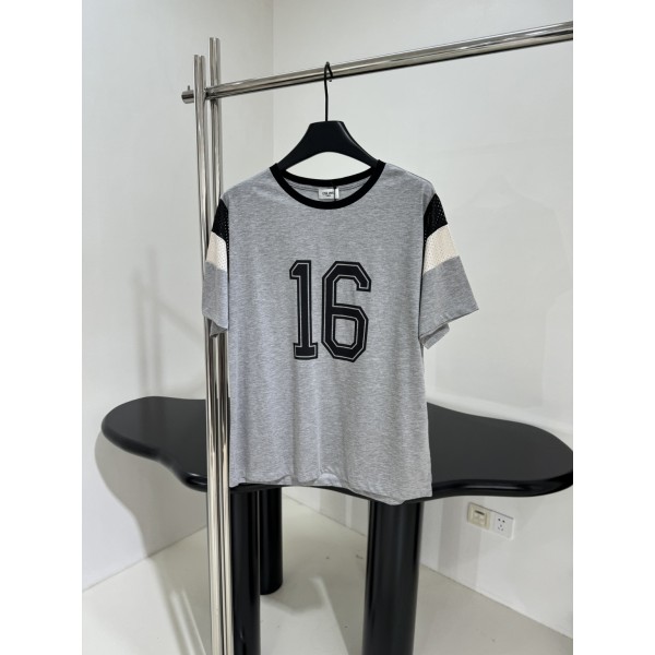 셀린느 24 춘하 신상품 평지 프린트 티셔츠 면 니트 저지 원단으로 제작되었으며 16과 브랜드 로고 영문 실크스크린 프린팅이 장식 톤온톤 네크라인과 소매단, 골지 소매와 밑단