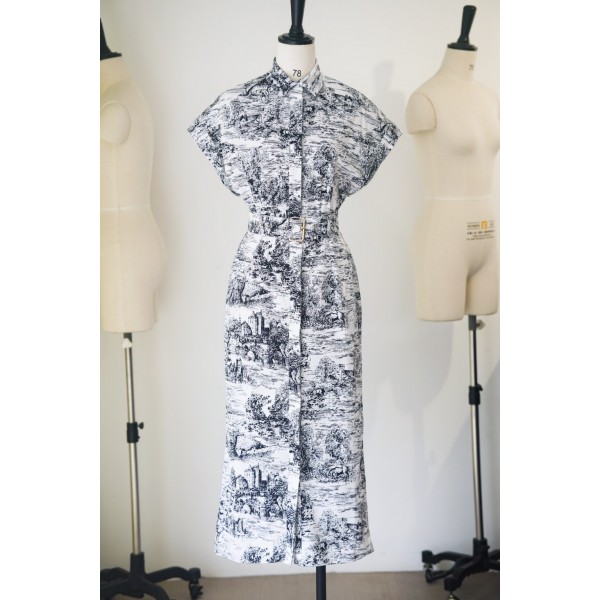 DIOR 25 스카치 실크 벨트 원피스 클래식한 애니멀 히스토리 아이콘과 캐슬이 스코틀랜드 민담을 담아낸 컬렉션 영감의 정수를 포착하고 블루 실크 원단으로 정교하게 제작된 일자핏에 사이드 슬릿 포켓 톤온톤의 CD 벨트로 허리라인을 살려 격조를 향상시킴