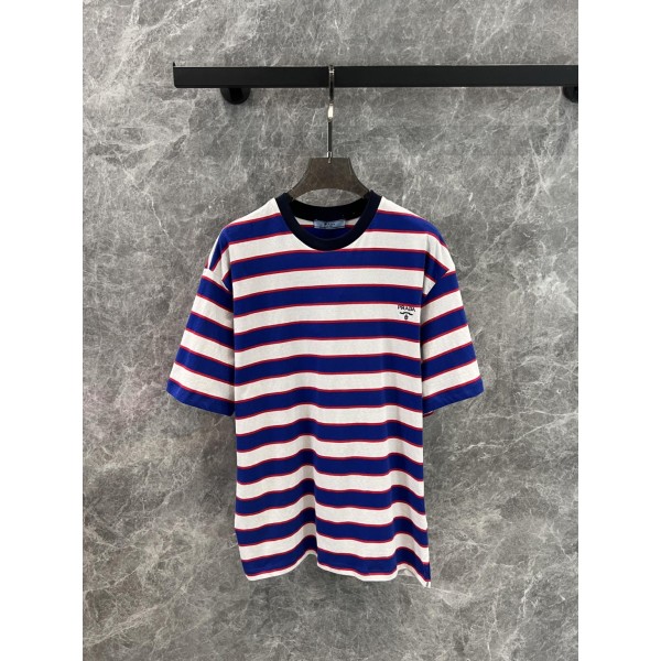 프라다 25 신상 레드 블루 스트라이프 로고 라운드넥 반팔 티셔츠 심플하고 여유로운 빈티지함이 어우러진 정밀한 저지 면 소재에 컬러풀한 스트라이프 패턴 가슴 로고 자수 포인트 젠더리스 컷팅으로 여러 벌의 레이어드 가소성을 부여 전통스타일을 다른 비율로 재해석하여 모던한 멋을 살림