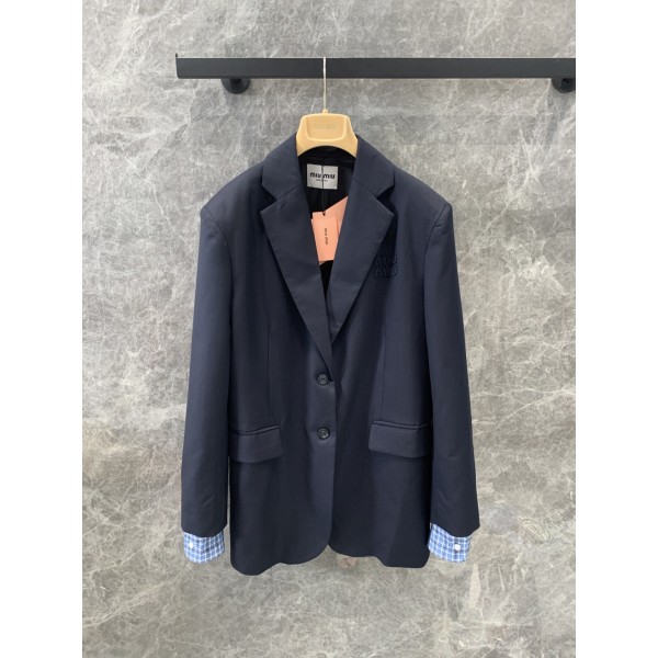 미우미우 25 신상 블루 체크 셔츠 소매 울 정장 코트 루즈핏 캐주얼 무난함, 가슴 장식 로고 아플리케 자수 커스텀 2개의 버튼 여밈, 블루 체크 셔츠 소매 단추 전체적인 작업과 질감이 굿 폴로나 셔츠와 레이어드 하셔도 굿