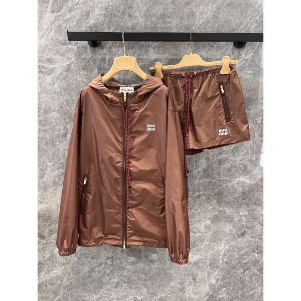 미우미우 25 신상 자외선 차단 스트링 후드 코트+스트링 반바지 세트 질감 탄탄, 상체 컴포트 배기 장식 밑단 입체 레터링 포인트 포켓 레더 트리밍 스트링 조절 호응 후드 디자인 최신 유행 하이패션 패키지
