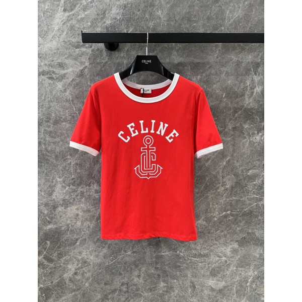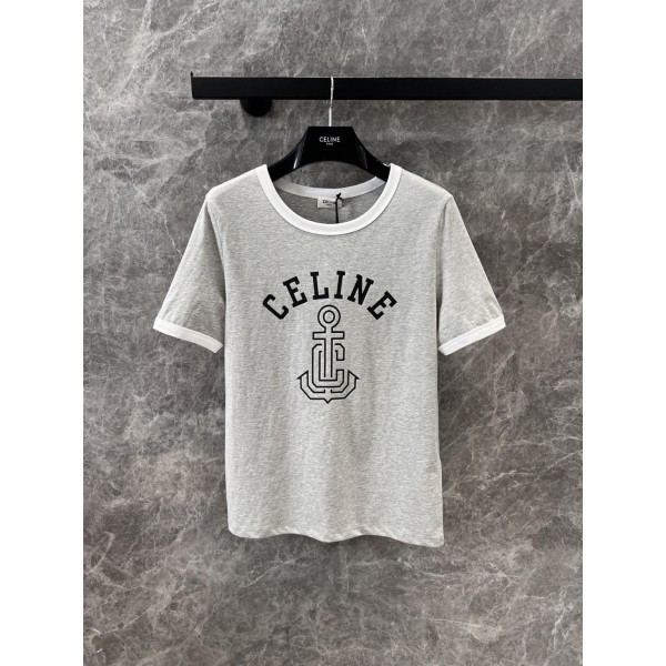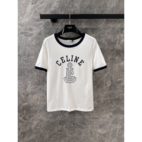 셀린느 25 봄여름 신상 레터링 프린트 라운드넥 반팔티 독점 하이버전으로 출시 네이티브 코튼 소재의 통기성 있고 편안한 질감의 슬림 티셔츠 순면 소재에 살짝 스판기가 들어가 날씬해 보이는 느낌을 주며 네크라인 소매에 컬러풀한 스크랩으로 포인트를 주었으며 가슴의 선명한 프린트로 아치형 레터링 하단의 펀칭 보트 닻 패턴으로 심플한 레터링 로고가 포인트로 고급스러운 아이덴티티를 연출 이너웨어 하나에도 컬러풀한 스타일리쉬한 아이템