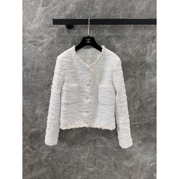 샤넬 25P 신상 클래식 유백색 트윌 트위드 코트 고급 맞춤 트위드 편직 원단, 멋스러운 진주 롤업 버튼 디자인 멋스러운 화이트 문라이트 컬러 부드러우면서도 고급스러운 입체 컷팅 핏