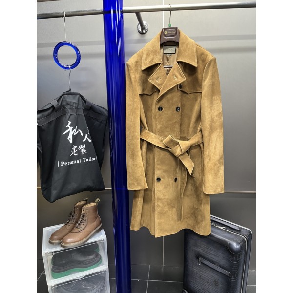 구찌 빈티지 퓨처스 스웨이드 트렌치코트 이탈리안 우아함과 모던함의 완벽한 균형 70년대 히피정신이 만난 스타 트렉의 미학 모델번호: AG23104 최고급 스웨이드 소가죽, 엄선된 이태리 베지터블 소가죽 구찌만의 융감 광택 공법으로 처리되어 무광 스웨이드 가죽의 느낌을 주며 촉감이 섬세하고 부드러움
