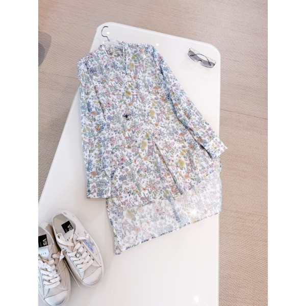 DIOR 25S 면 플라워 실크 자수 셔츠 블라우스 컬러의 Flowers Calendar Allover 패턴으로 면 원단으로 정교하게 뒷면이 길쭉하게 제작된 스타일리시한 핏에 차이나카라와 앞면 단추 여밈으로 전원적인 플로럴과 별자리 심볼이 절묘하게 어우러져 있음