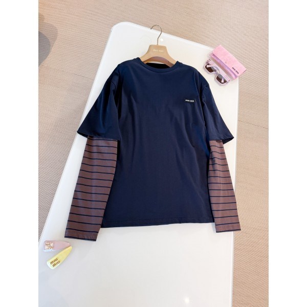 MIUMIU 25S 페이크 투피스 면 배색 니트 긴팔 티 니트와 스트라이프 등 스타일 아이콘의 조화가 현대적 시각에서 해석한 레이어드룩으로 시크한 스타일링과 자유롭고 개성있는 레이어드룩 연출