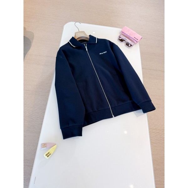 MIUMIU 25S 네이비 미우 자수 칼라 집업 재킷 시그니처 폴로 셔츠의 디자인을 재해석한 이 짧은 재킷에 폴로넥과 자수 로고, 접착 피케와 테크니컬한 니트 원단으로 박시한 핏에 부드러움과 구조감을 더해줌