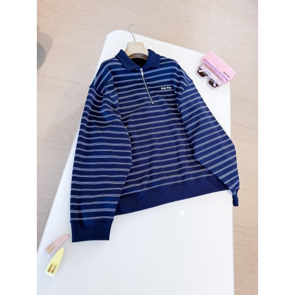 MIUMIU 25S 스트라이프 반집업 니트 터틀넥 폴로 톱 스쿨룩의 핵심 앵커 포인트인 클래식한 블루-화이트 스트라이프 반집업 디자인으로 폴로의 포멀함을 약화시켜 캐주얼함을 더해주며 하이웨스트 실루엣으로 전체적인 비율을 장식함