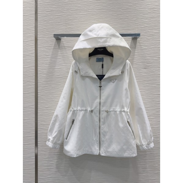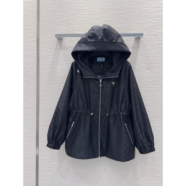 프라다 25 신상 후드 트렌치코트 삼각 체크 쟈가드, 스트링 조임, 옆지퍼 포켓