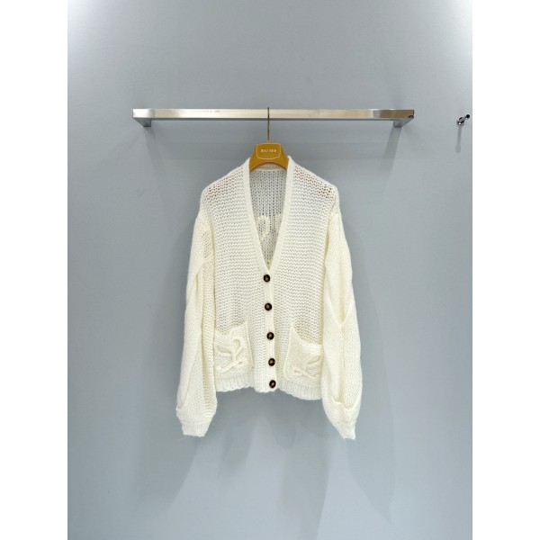 LOEWE 크림 화이트 앙고라 가디건 가벼운 앙고라 혼방 니트 소재 루즈핏의 나른하고 캐주얼한 핏 리얼 앙고라 긴털은 신축성 있고 볼륨감 있는 실루엣 리얼 앙고라 통화 특수 직조 완성 투포켓 장식으로 수제 니트 로고
