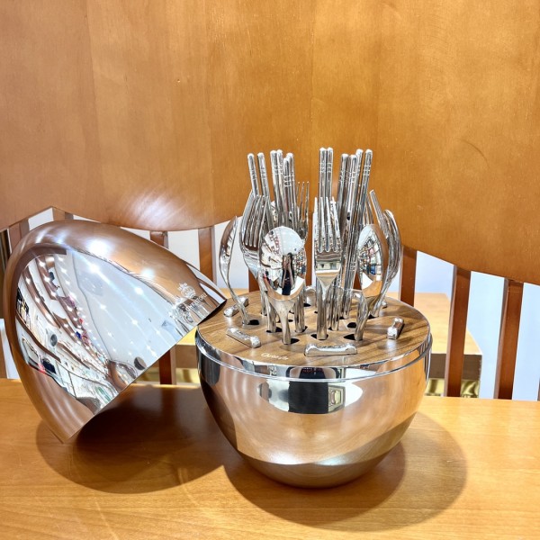 크리스토플 퀸덤 무드 아시아 커트러리 세트 아시아판, 젓가락은 중국 음식 문화의 상징 중 하나 재질: 폴리싱 304 스테인리스 스틸 케이스와 호두나무 커팅면 안쪽 원반 구성: 젓가락*6 수저걸이*6 포크*6 국자*6 사이즈: 케이스 27*18.6cm 젓가락23cm 수저걸이 4cm 국자17cm 포크17cm
