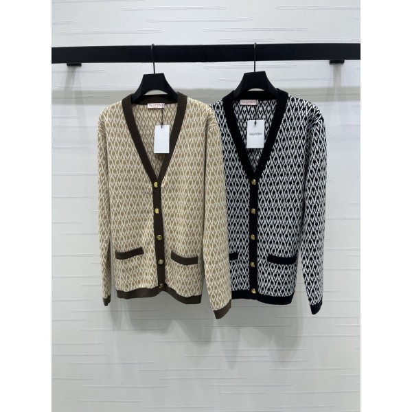 발렌티노 2025 초가을 최신 브이넥 자카르 니트 카디건 맞춤 울 원단 텍스처로 섬세한 착용감이 돋보임 신축성 있는 원단 핏에 슬림해 보이는 프론트 원단 각인 로고 장식으로 브랜드의 아이덴티티를 보여주며 연령에 구애받지 않고 스타일리쉬한 룩을 연출해 줌