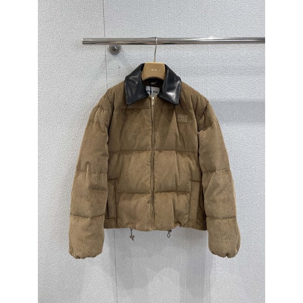 미우미우 25Fw 신상 코듀로이 가죽 넥 패딩 점퍼 독점 yb개발, 고급 버전 출시 빈티지 브라운 톤의 코듀로이 원단을 선택 세로 무늬의 질감을 지니고 빛 속에서 섬세한 층위를 물들임 블랙 컬러의 리얼 소가죽 터틀넥이 조합된 디자인은 전체적으로 쿨한 느낌을 더해주며 달콤한 소녀와 쿨 언니의 스타일 전환에 포인트 오버사이즈의 볼륨감 있는 컷팅 느슨한 느낌으로 캐주얼한 겨울 스타일링을 완성