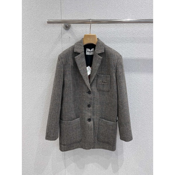 미우미우 25FW 신상 숄카라 체크 포켓 정장 코트 단독 yb개발, 고급 버전 출시 빈티지 체크 무늬의 정장 울 원단을 선택 클래식한 터틀넥으로 정장 유전자를 이어받았지만 어깨가 넓은 소매와 오버사이즈 루즈핏으로 파격적인 스타일 가슴 포켓에 브랜드 로고를 포인트 깔끔한 세 개의 버튼 디자인은 빈티지한 분위기 소매 단추의 정교함이 전체 스타일링의 화룡점정