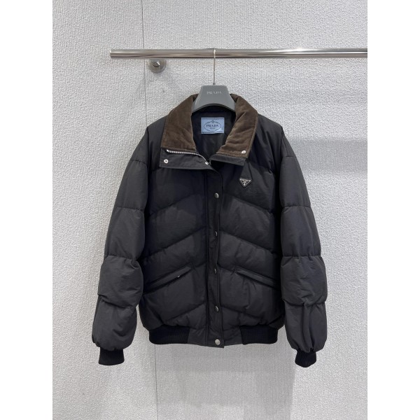 프라다 25 신상 삼각로고 스탠드카라 포플린 패딩 점퍼 스탠드카라 디자인으로 클래식한 실루엣을 재구성 90 화이트 구스다운 패딩과 브라운 코듀로이 네크라인 퀼팅된 구조는 풍성하고 입체적이어서 따뜻함을 유지하면서도 부담스럽지 않은 실루엣을 완성하여 다양한 스타일링에 적합함