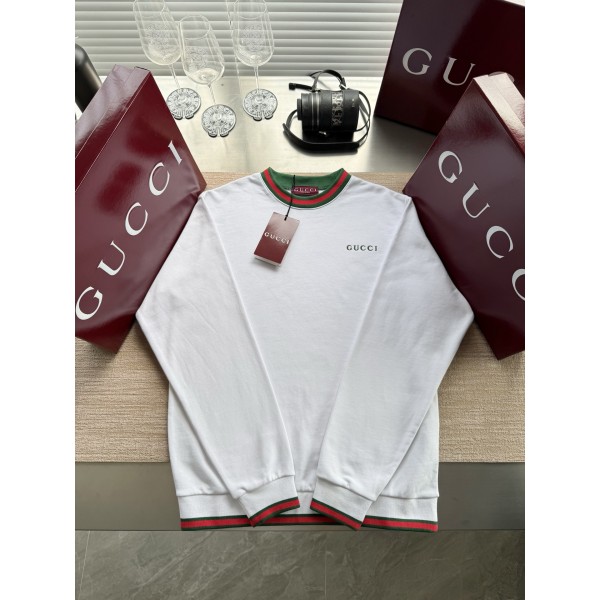구찌 2025 FW 러플 자수 라운드 맨투맨 ZP 10200 구매 분해 제작 화이트 양면 피케 원단 맞춤, 100% 면 수입 원단 맞춤 시그니처 골지 넥 소매 밑단 맞춤 그린 레드 그린 클래식 테이프 장식 가슴 앞부분 구찌 러플 자수 로고 진정한 1:1 재현