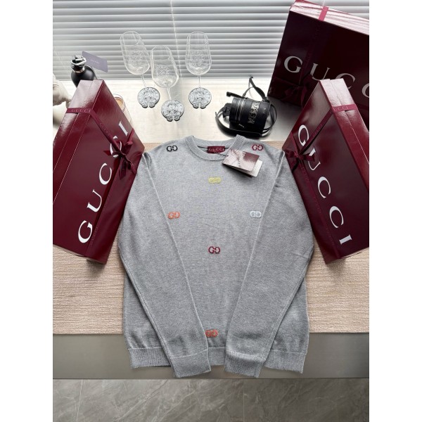 구찌 2025 FW 그라데이션 자카드 라운드 니트 ZP 13600 구매 분해 제작 그레이 캐시미어 원단 맞춤 제작, 캐시미어 100% 실 제작 앞판 장식 더블 G 그라데이션 자카드 로고 자카드 원단과의 일체화, 골지 네크라인 밑단 고정 초밀도로 부분 짜임, 진짜 1:1 재현
