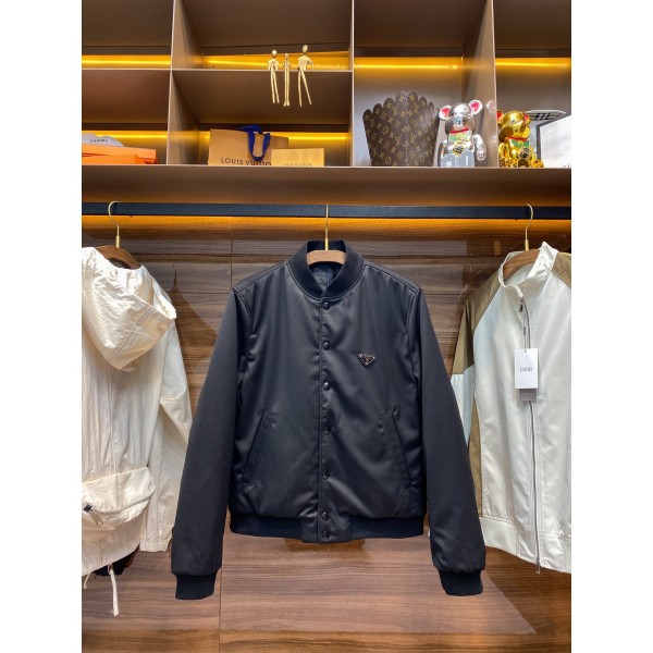 PRADA 25FW 신상 블랙 트윌 울 야구점퍼 남성 클래식 삼각로고 버클 보온 점퍼 무역회사 채널 희소, 동시 홈페이지 판매 100% 면 양모를 선별하여 수입한 것으로 맞춤 직물과 염색을 통해 제작된 트윌 양모 원단으로 제작 이 양모 원단은 특수 공정으로 처리되어 표면이 섬세하고 광택이 있으며 검은색 섬유 안감은 뛰어난 통기성과 열 조절성을 가지고 있음 가슴에 클래식한 에나멜 코팅 삼각 로고 패치 장식 52사이즈: 어깨너비50-가슴둘레124-총장54-소매69cm