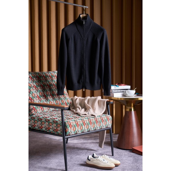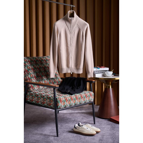 BC 골지 반목 울 니트 지퍼 가디건 100% 울 소재를 엄선하여 부드럽고 섬세한 촉감으로 마치 구름처럼 몸을 부드럽게 감싸주어 독보적인 편안함을 선사함 니트 결이 섬세하고 균일하며 모든 디테일이 정교한 솜씨를 자랑함 밑단과 소매 끝단은 촘촘한 나사산이 바디라인에 밀착되어 찬바람이 들어오는 것을 방지함과 동시에 심플한 멋스러움 하이넥 지퍼 디자인은 이 스웨터의 포인트 아이템
