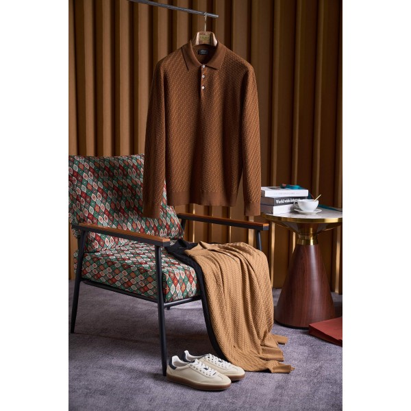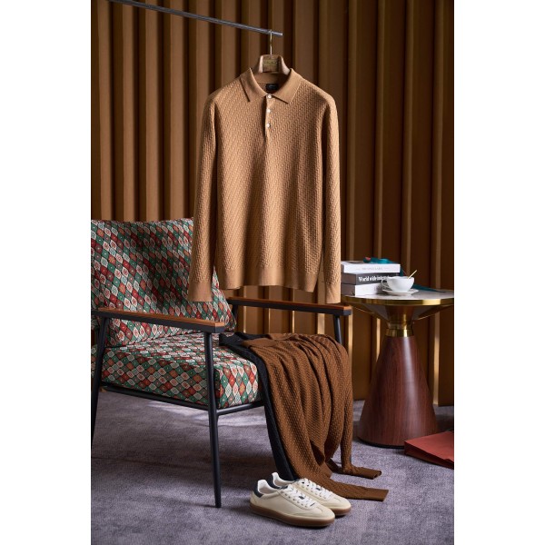 브리오니 실크 혼방 카라멜 컬러 짜임 폴로넥 니트 36% 실크, 34% 캐시미어, 30% 아크릴 울 혼방으로 정교한 짜임과 함께 섬세한 결과 편안한 터치감을 선사함 따뜻하고 위트 있는 느낌은 물론 다양한 의상에 손쉽게 매치가능 심플하면서도 세련되어 데일리룩은 물론 비즈니스룩까지 완벽 세련된 단추 포인트로 빈티지한 멋을 더해줌