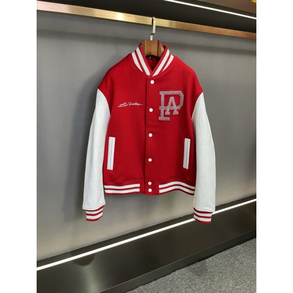LV 2025 신상 남녀공용 야구복 재킷 몸 부분은 새빨간 캐시미어 원단으로 촉감이 부드럽고 색상이 선명하며 고급스러움이 가득함 흰색 소매는 체커판 엠보 소가죽으로 질감이 있음 오른쪽 가슴의 루이비통 자수가 정교하고 왼쪽 가슴의 스와로브스키 스톤으로 파마된 PA 레터링이 돋보임 등판을 보면 불규칙한 크기의 진주로 럭셔리함의 극치 레드 앤 화이트 컬러의 스크루 네크라인과 밑단 디테일
