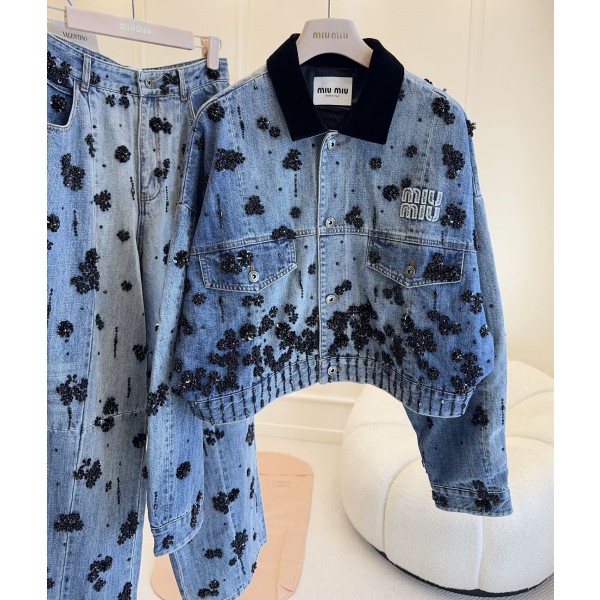미우미우 업사이클드 라인 비즈 데님 코트 핸드메이드 비즈 플라워, 블랙 벨벳 터틀넥 빈티지하면서도 반항적인 쇼트컷+메탈 버튼 디테일 만점, 리미티드 라인 개성 만점 데일리 통근이나 스트리트 룩에도 잘 어울리며 하이웨스트 팬츠/미니스커트를 매치해 가볍게 get
