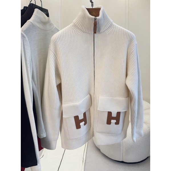 에르메스 H 포켓 스웨터 코트 100% 울 소재로 부드럽고 도톰해 가을과 겨울에 입기에 안성맞춤 크림화이트 + 브라운 컬러의 가죽 H 포켓 지퍼 여밈 + 스탠드 칼라 디자인 실용적이면서도 스타일리쉬해 출퇴근 캐주얼까지