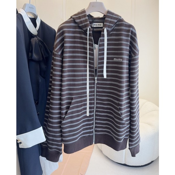 미우미우 2025 신상 스트라이프 후드집업 저지 원단으로 부드럽고 편안하며 가슴에 브랜드 아플리케 로고 디테일이 만점 지퍼 여밈 + 후드 디자인으로 실용적이면서도 캐주얼하며 스트라이프 요소가 빈티지하고 캐주얼함 편안함과 패션을 겸비한 필수 아이템