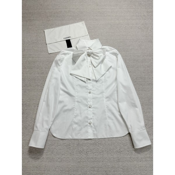 샤넬 25K 리본 셔츠, ZP25300 면포플린으로 정성껏 제작되었으며 맞춤 제작된 100수 새틴 면은 날실과 씨실 교직 횟수가 더 많고 일반 면보다 밀도가 높으며 표면이 매끄럽고 섬세하며 통기성이 좋아 피부에 밀착되어 부드럽고 편안하며 약간의 서늘함이 있음 빅 리본 디자인이 우아하고 달콤함