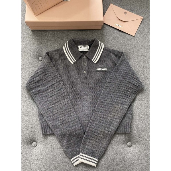 미우미우 울 캐시미어 혼방 폴로 니트 이번 컬렉션은 브랜드 정체성을 더욱 다짐 ZP 환원, 52% 울 + 48% 캐시미어 혼방으로 제작 실을 주문 제작하고 매우 가는 천연섬유가 부드러운 촉감을 보장함 인체에 대한 편안함은 다른 소재로 대체할 수 없음 5핀 스톨 머신의 단면 펀칭 공법으로 가슴 부분의 로고가 특징 수입기 엠보싱머신만이 제작할 수 있음 긴 시간이 소요되며, 올해는 이 제품을 강력 추천