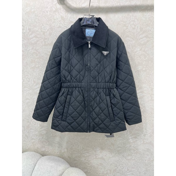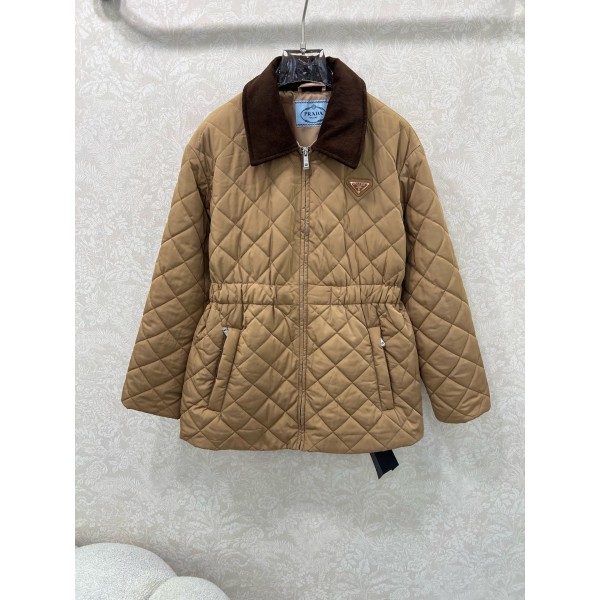프라다 25 신형 코듀로이 칼라 퀼팅 패딩 퀼팅 엠보싱, 양쪽 대용량 지퍼포켓에 입체적인 스타일링 가슴의 시그니처 레터링 삼각 메탈 장식 스트레치 조임 디테일로 바디라인을 감싸주며 최적의 비율로 분할하여 가볍고 스타일리쉬하게 연출가능 보온과 트렌디함을 모두 갖춘 커스텀 원단 부자재 승인 버전