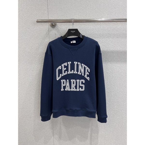 Celine 25 신상 화이트 레터링 로고 네이비 라운드 맨투맨 화이트 레터링 로고는 빈티지한 아메리칸 폰트로 입체감 있게 표현되어 시각적 초점을 단단히 고정시켜 브랜드 인지도를 높임 이너 하이넥을 베이스로 하여 레이어드룩을 완성 가을과 겨울의 다양한 룩에 쉽게 적합함