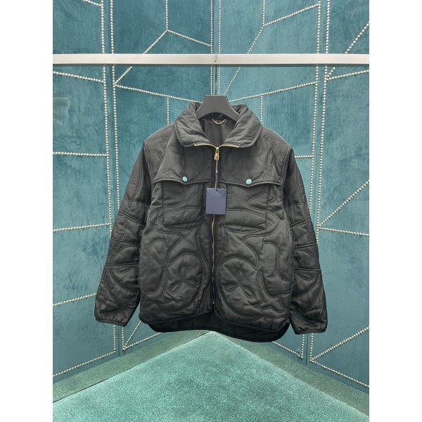 LV 새로운 퀼팅 셔츠형 재킷 캐주얼한 실루엣으로 2024 가을과 겨울 쇼에 등장함 동일한 색상의 실을 통해 기술 캔버스 위에 LV Arabesque 자수를 그려내고 확대된 Monogram 꽃들이 서부 스타일 문양에 교묘하게 융합되었음 LV 레터링으로 등 부분을 표시하고 똑딱이 단추로 가슴 포켓을 강조하여 경쾌한 디자인