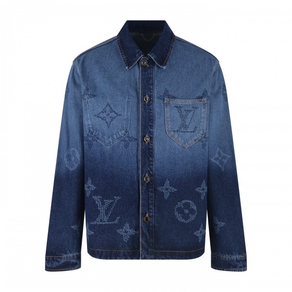 LV 하비 보카시 데님 자켓 연한 것부터 진한 것까지 동시에 원단에 비친 예술적 번짐처럼 각 인치마다 복고와 현대의 대화가 숨겨져 있음 클래식한 터틀넥 디자인과 메탈 버튼이 어우러져 디테일에 브랜드의 장인 정신을 한껏 드러냄 루즈한 핏은 다양한 스타일에 잘 어울리며 고급 패션 유전자를 일상 패션에 주입한 절묘한 작품