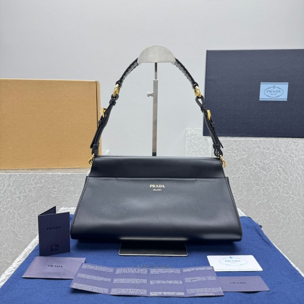 프라다 25 블랙 미디엄 가죽 숄더백 이번 시즌 샛별 디자인의 토트/숄더 돋보이며 우아하고 깔끔한 바디 디자인에 클래식한 골드 로고 탈부착이 가능한 유니크한 아이디어 스트랩으로 포인트 광택이 나는 소가죽 가방은 정말 질감이 가득함 통근 데이트 모두 매력적 모델번호 1BC262 사이즈 : 32x15x12cm