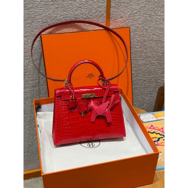 Style: Kelly Colour:95/Braise Size:25*20*13 Leather:Bright faced Alligator imported From France which originally from Mississippi Hardware: Gold 켈리백 25cm, 페라리 레드, 반짝이는 아메리카악어 프랑스 수입 순정 1등급 악어, 미시시피 원산지 골드 버클, 고급 수제 맞춤 제작 핸드메이드 못, 핸드메이드 철물, 정강 도금 18k 철물 주문 실사