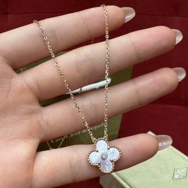 반클리프 2025 크리스마스 한정판 네잎클로버 목걸이 18K 골드에 핑크 베니어, 중앙 다이아몬드 세팅 패모는 다양한 빛에서 분홍색, 녹색 및 파란색 광택을 굴절시켜 고급스러움이 가득하고 체인이 섬세하고 길이가 적당해 데일리룩이나 드레스로도 돋보임