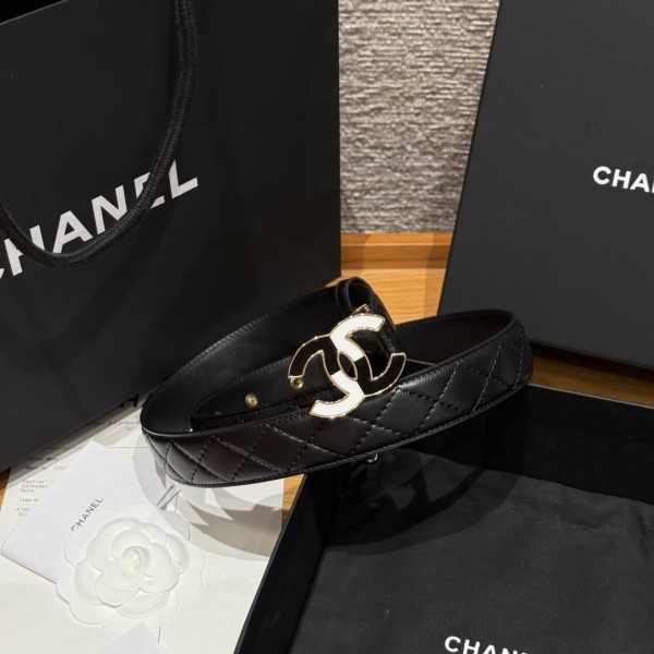 샤넬 신상 여성벨트 클래식한 메탈 더블 C 레터링 로고 퀼팅 양가죽을 사용하였으며 느낌이 매우 부드러움 철물 버클이 매우 잘 가공되어 허리라인을 나타내며 스커트 트렌치코트 청바지에 모두 나이스 너비 30mm