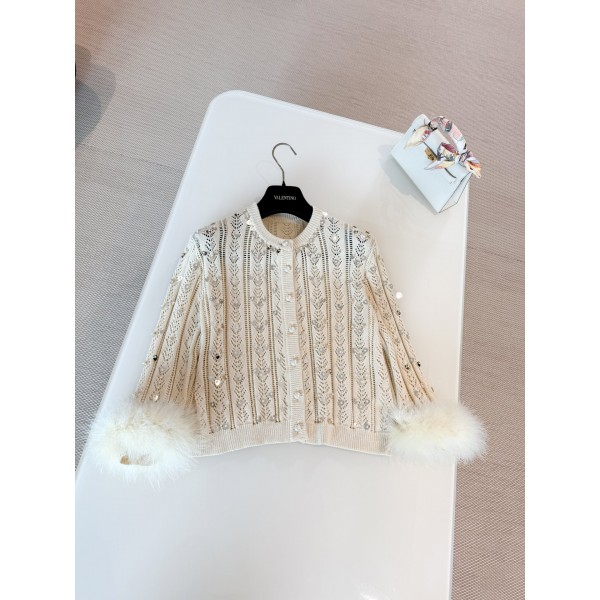 VALENTINO 25S 깃털 소매 큐빅 스팽글 니트 카디건 베이지 컬러의 니트 소재에 펀칭으로 하트 등의 패턴이 섬세하게 표현되어 반짝임을 더해주고 소매 끝에는 보풀이 장식되어 있어 부드럽고 위트있는 느낌