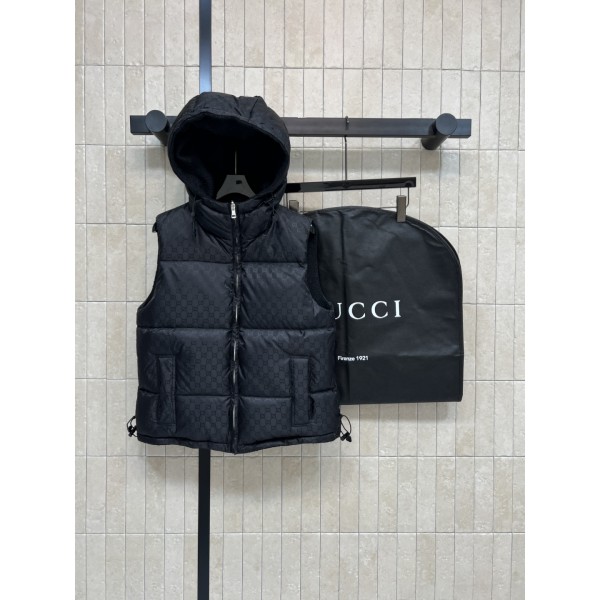 구찌 25 가을/겨울 신상 더블 G 자카드 양면 패딩 조끼 클래식한 블랙 더블 G 올드 플라워로 인식도 매우 높음 한면은 트위드 우븐 패딩 고퀄리티 패딩 보온력 만점 가을 겨울 입기 딱 좋은 후드 디자인 지퍼 여밈으로 입고 벗기 편하며 통근 캐주얼까지 홀드 짧은 컷팅으로 날씬해 보이고 레이어드하기 좋은 아이템