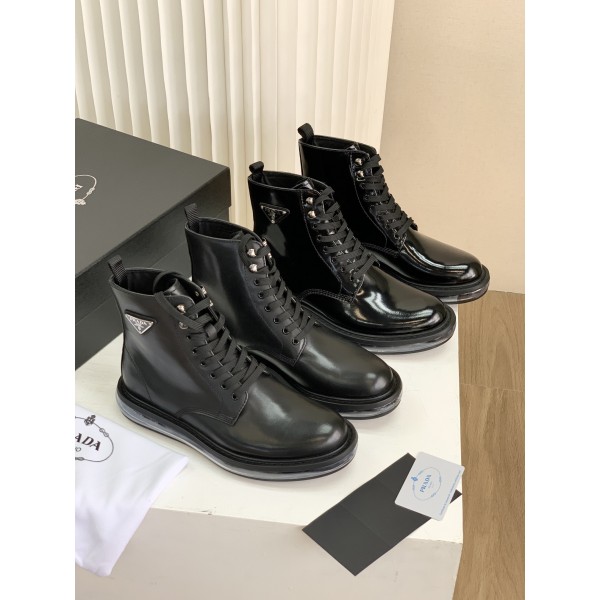 프라다 최고급, 베트남 원재료 제작, 공식 홈페이지 동시 남성 비즈니스 하이탑 쿠션 스트랩 캐주얼 부츠 테두리 비즈와 송아지 가죽 구두 표면 바깥쪽에는 클래식한 삼각 메탈 에나멜 로고 풀 메탈 아이 버튼에는 면 신발 끈, 뒤축에는 패브릭 슈즈 루프 개방, 신고 벗기 편리, 순정 초유연 쿠션 뒷축에는 실버 로고 PRADA 이니셜 로고 장식 고무 바닥에는 감싼 독특한 스포티함 풀 소가죽 안감, 발감 최고